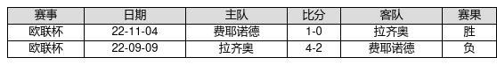 费耶诺德 VS 拉齐奥两队近10年的交战次数为2场,费耶诺德1胜0平1负,赢球概率为50%,平局概率为0%,输球概率为50%。
