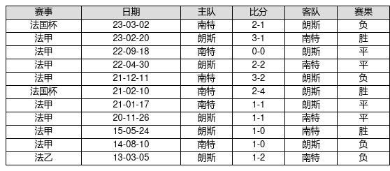 朗斯 VS 南特两队近10年的交战次数为11场,朗斯3胜4平4负,赢球概率为27.3%,平局概率为36.4%,输球概率为36.4%。