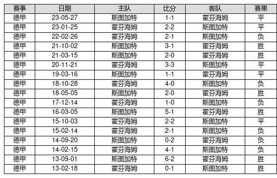 斯图加特 VS 霍芬海姆两队近10年的交战次数为17场,斯图加特6胜5平6负,赢球概率为35.3%,平局概率为29.4%,输球概率为35.3%。