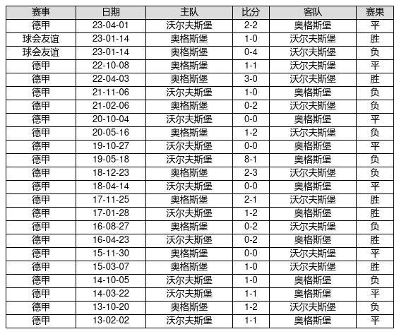 奥格斯堡 VS 沃尔夫斯堡两队近10年的交战次数为23场,奥格斯堡6胜8平9负,赢球概率为26.1%,平局概率为34.8%,输球概率为39.1%。