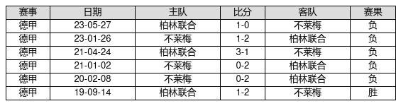 不莱梅 VS 柏林联合两队近10年的交战次数为6场,不莱梅1胜0平5负,赢球概率为16.7%,平局概率为0%,输球概率为83.3%。