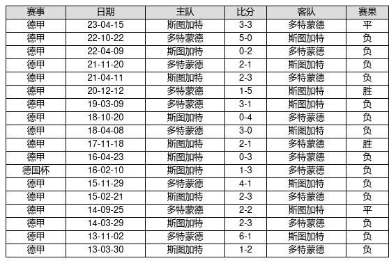 斯图加特 VS 多特蒙德两队近10年的交战次数为18场,斯图加特2胜2平14负,赢球概率为11.1%,平局概率为11.1%,输球概率为77.8%。