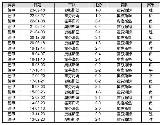 奥格斯堡 VS 霍芬海姆两队近10年的交战次数为21场,奥格斯堡6胜2平13负,赢球概率为28.6%,平局概率为9.5%,输球概率为61.9%。