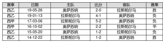 奥萨苏纳 VS 拉斯帕尔马两队近10年的交战次数为6场,奥萨苏纳2胜1平3负,赢球概率为33.3%,平局概率为16.7%,输球概率为50%。