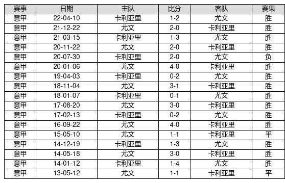 尤文 VS 卡利亚里两队近10年的交战次数为17场,尤文14胜2平1负,赢球概率为82.4%,平局概率为11.8%,输球概率为5.9%。