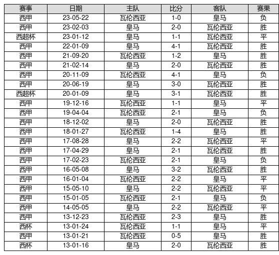 皇马 VS 瓦伦西亚两队近10年的交战次数为25场,皇马13胜7平5负,赢球概率为52%,平局概率为28%,输球概率为20%。