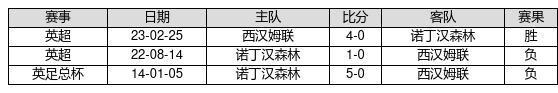 西汉姆联 VS 诺丁汉森林两队近10年的交战次数为3场,西汉姆联1胜0平2负,赢球概率为33.3%,平局概率为0%,输球概率为66.7%。