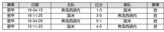国米 VS 弗洛西诺内两队近10年的交战次数为4场,国米4胜0平0负,赢球概率为100%,平局概率为0%,输球概率为0%。