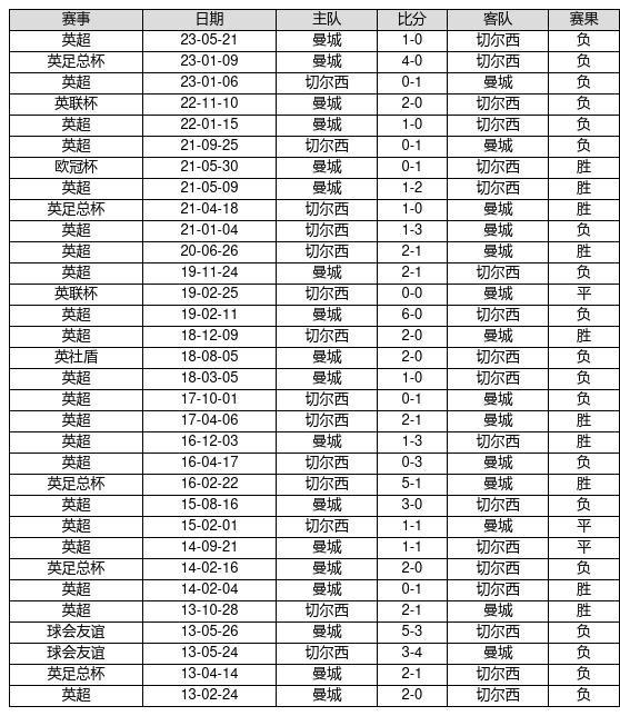 切尔西 VS 曼城两队近10年的交战次数为32场,切尔西10胜3平19负,赢球概率为31.3%,平局概率为9.4%,输球概率为59.4%。