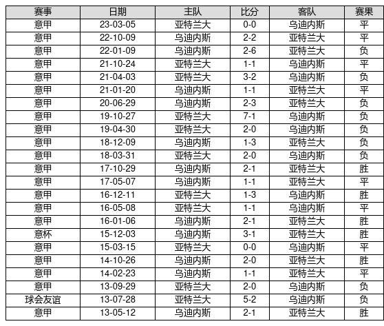 乌迪内斯 VS 亚特兰大两队近10年的交战次数为23场,乌迪内斯6胜8平9负,赢球概率为26.1%,平局概率为34.8%,输球概率为39.1%。