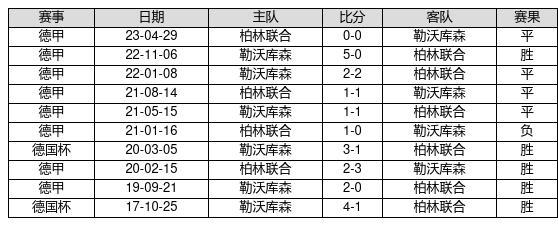 勒沃库森 VS 柏林联合两队近10年的交战次数为10场,勒沃库森5胜4平1负,赢球概率为50%,平局概率为40%,输球概率为10%。