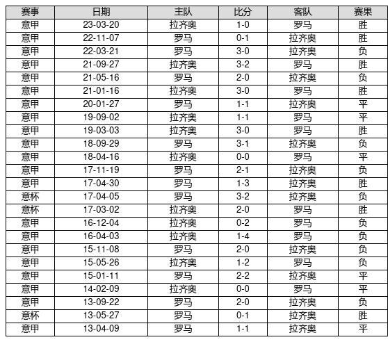 拉齐奥 VS 罗马两队近10年的交战次数为24场,拉齐奥8胜6平10负,赢球概率为33.3%,平局概率为25%,输球概率为41.7%。
