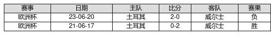 威尔士 VS 土耳其两队近10年的交战次数为2场,威尔士1胜0平1负,赢球概率为50%,平局概率为0%,输球概率为50%。