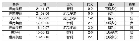厄瓜多尔 VS 智利两队近10年的交战次数为7场,厄瓜多尔2胜1平4负,赢球概率为28.6%,平局概率为14.3%,输球概率为57.1%。