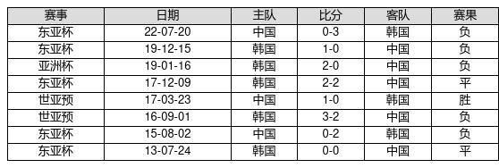 中国 VS 韩国两队近10年的交战次数为8场,中国1胜2平5负,赢球概率为12.5%,平局概率为25%,输球概率为62.5%。