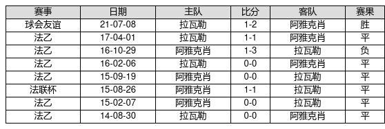 阿雅克肖 VS 拉瓦勒两队近10年的交战次数为8场,阿雅克肖1胜6平1负,赢球概率为12.5%,平局概率为75%,输球概率为12.5%。