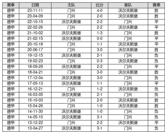 门兴 VS 沃尔夫斯堡两队近10年的交战次数为22场,门兴7胜7平8负,赢球概率为31.8%,平局概率为31.8%,输球概率为36.4%。