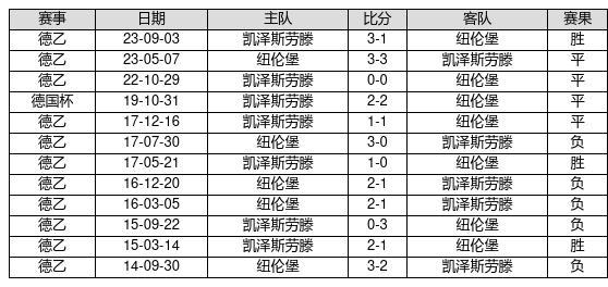 凯泽斯劳滕 VS 纽伦堡两队近10年的交战次数为12场,凯泽斯劳滕3胜4平5负,赢球概率为25%,平局概率为33.3%,输球概率为41.7%。