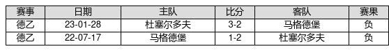 马格德堡 VS 杜塞尔多夫两队近10年的交战次数为2场,马格德堡0胜0平2负,赢球概率为0%,平局概率为0%,输球概率为100%。
