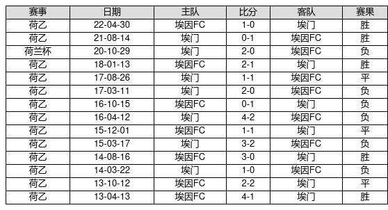 埃因FC VS 埃门两队近10年的交战次数为14场,埃因FC5胜3平6负,赢球概率为35.7%,平局概率为21.4%,输球概率为42.9%。