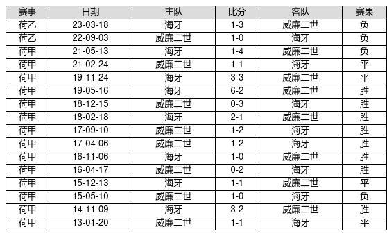 海牙 VS 威廉二世两队近10年的交战次数为16场,海牙8胜4平4负,赢球概率为50%,平局概率为25%,输球概率为25%。