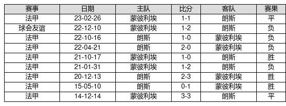 蒙彼利埃 VS 朗斯两队近10年的交战次数为9场,蒙彼利埃3胜2平4负,赢球概率为33.3%,平局概率为22.2%,输球概率为44.4%。