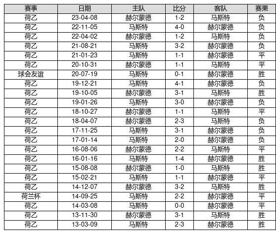 赫尔蒙德 VS 马斯特两队近10年的交战次数为23场,赫尔蒙德7胜7平9负,赢球概率为30.4%,平局概率为30.4%,输球概率为39.1%。
