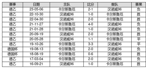 汉诺威96 VS 卡尔斯鲁厄两队近10年的交战次数为12场,汉诺威965胜2平5负,赢球概率为41.7%,平局概率为16.7%,输球概率为41.7%。