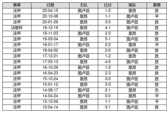里昂 VS 图卢兹两队近10年的交战次数为18场,里昂13胜4平1负,赢球概率为72.2%,平局概率为22.2%,输球概率为5.6%。