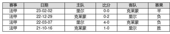 克莱蒙 VS 里尔两队近10年的交战次数为4场,克莱蒙1胜1平2负,赢球概率为25%,平局概率为25%,输球概率为50%。
