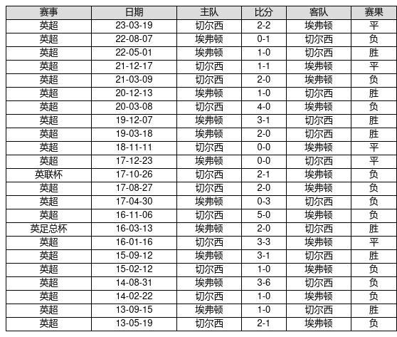 埃弗顿 VS 切尔西两队近10年的交战次数为23场,埃弗顿7胜5平11负,赢球概率为30.4%,平局概率为21.7%,输球概率为47.8%。