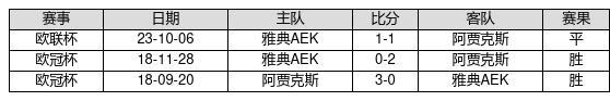 阿贾克斯 VS 雅典AEK两队近10年的交战次数为3场,阿贾克斯2胜1平0负,赢球概率为66.7%,平局概率为33.3%,输球概率为0%。