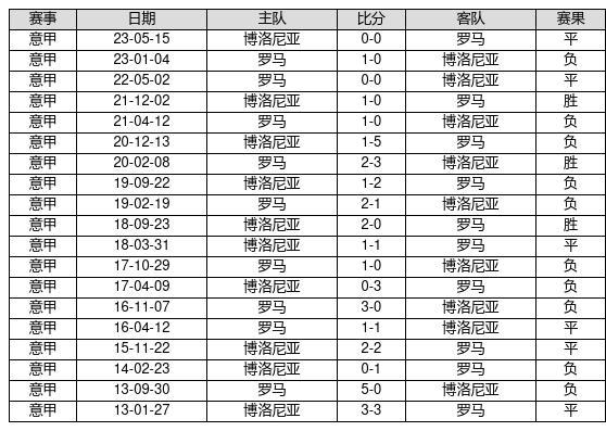 博洛尼亚 VS 罗马两队近10年的交战次数为19场,博洛尼亚3胜6平10负,赢球概率为15.8%,平局概率为31.6%,输球概率为52.6%。