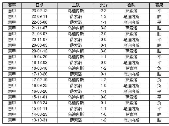 乌迪内斯 VS 萨索洛两队近10年的交战次数为20场,乌迪内斯8胜8平4负,赢球概率为40%,平局概率为40%,输球概率为20%。