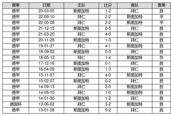 拜仁 VS 斯图加特两队近10年的交战次数为18场,拜仁15胜2平1负,赢球概率为83.3%,平局概率为11.1%,输球概率为5.6%。