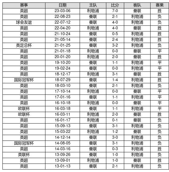 利物浦 VS 曼联两队近10年的交战次数为28场,利物浦10胜7平11负,赢球概率为35.7%,平局概率为25%,输球概率为39.3%。