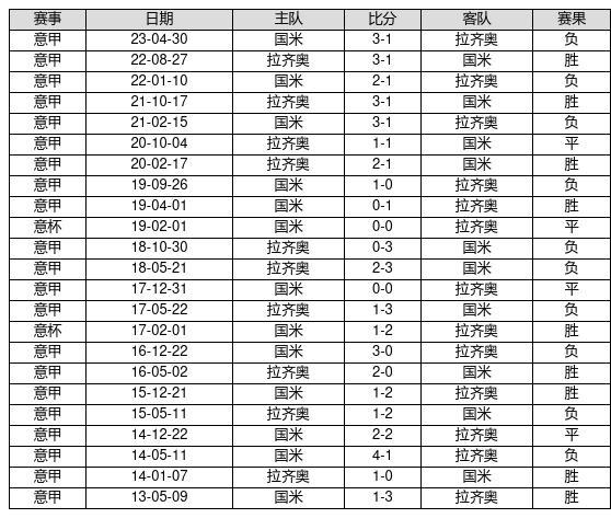拉齐奥 VS 国米两队近10年的交战次数为23场,拉齐奥9胜4平10负,赢球概率为39.1%,平局概率为17.4%,输球概率为43.5%。