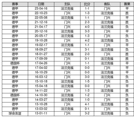 法兰克福 VS 门兴两队近10年的交战次数为24场,法兰克福6胜8平10负,赢球概率为25%,平局概率为33.3%,输球概率为41.7%。