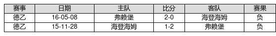 海登海姆 VS 弗赖堡两队近10年的交战次数为2场,海登海姆0胜0平2负,赢球概率为0%,平局概率为0%,输球概率为100%。