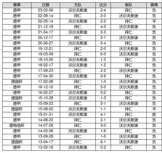 沃尔夫斯堡 VS 拜仁两队近10年的交战次数为26场,沃尔夫斯堡1胜3平22负,赢球概率为3.8%,平局概率为11.5%,输球概率为84.6%。