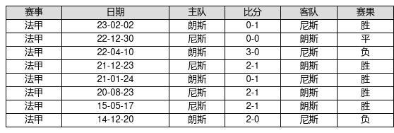 尼斯 VS 朗斯两队近10年的交战次数为8场,尼斯5胜1平2负,赢球概率为62.5%,平局概率为12.5%,输球概率为25%。