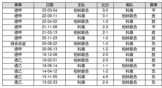 柏林联合 VS 科隆两队近10年的交战次数为14场,柏林联合7胜3平4负,赢球概率为50%,平局概率为21.4%,输球概率为28.6%。