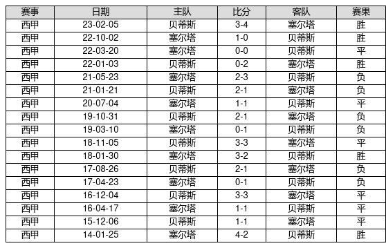 塞尔塔 VS 贝蒂斯两队近10年的交战次数为17场,塞尔塔5胜6平6负,赢球概率为29.4%,平局概率为35.3%,输球概率为35.3%。