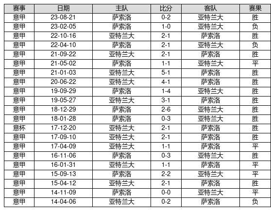 亚特兰大 VS 萨索洛两队近10年的交战次数为21场,亚特兰大13胜5平3负,赢球概率为61.9%,平局概率为23.8%,输球概率为14.3%。