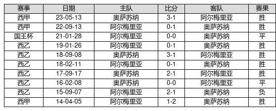 奥萨苏纳 VS 阿尔梅里亚两队近10年的交战次数为10场,奥萨苏纳7胜2平1负,赢球概率为70%,平局概率为20%,输球概率为10%。
