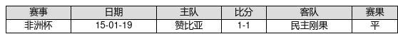 民主刚果 VS 赞比亚两队近10年的交战次数为1场,民主刚果0胜1平0负,赢球概率为0%,平局概率为100%,输球概率为0%。