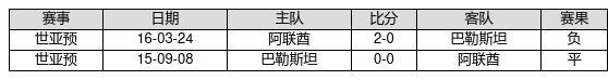 巴勒斯坦 VS 阿联酋两队近10年的交战次数为2场,巴勒斯坦0胜1平1负,赢球概率为0%,平局概率为50%,输球概率为50%。