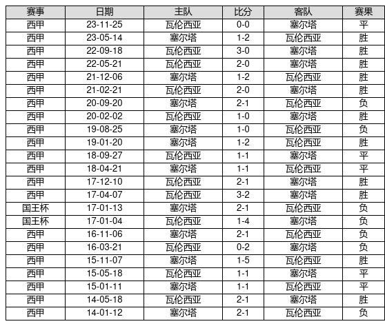 瓦伦西亚 VS 塞尔塔两队近10年的交战次数为23场,瓦伦西亚11胜5平7负,赢球概率为47.8%,平局概率为21.7%,输球概率为30.4%。