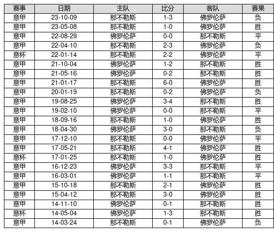 那不勒斯 VS 佛罗伦萨两队近10年的交战次数为23场,那不勒斯12胜6平5负,赢球概率为52.2%,平局概率为26.1%,输球概率为21.7%。
