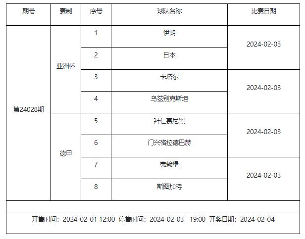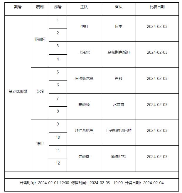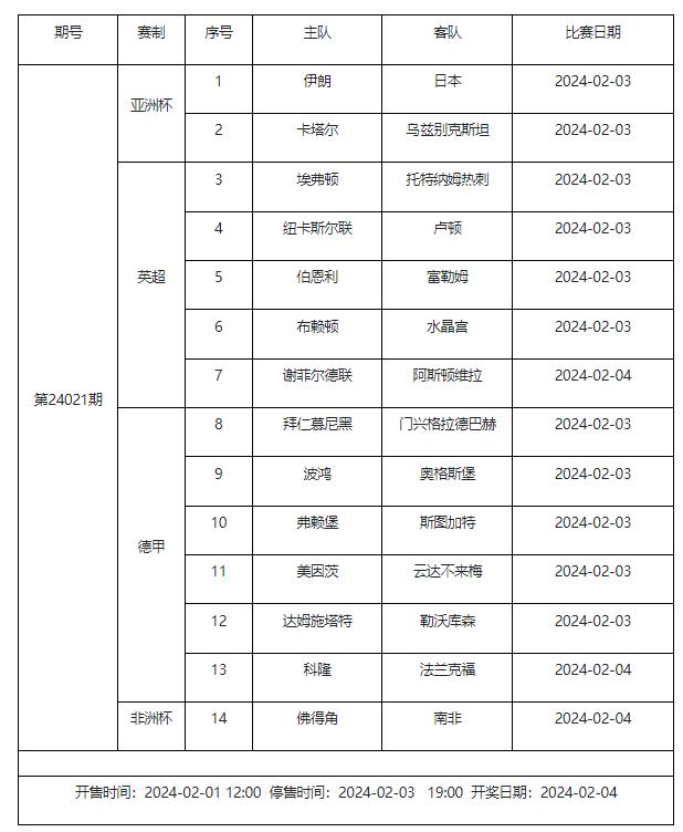 北京时间2024年2月1日,国家体彩中心发布了2月3日足彩赛程调整的通知。具体赛事变化如下:其中第24021期确定了亚洲杯的对阵情况,分别是伊朗vs日本、卡塔尔vs乌兹别克斯坦,完整赛程通知如下: